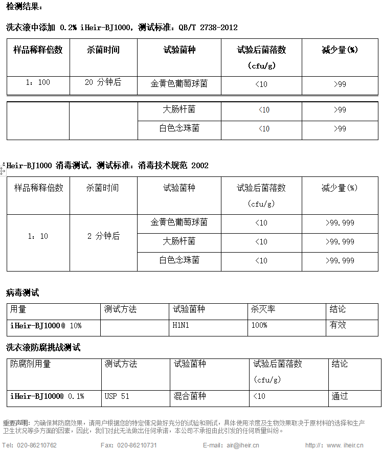 iHeir-BJ1000 是穩(wěn)定的復合銀水溶液,經過特殊的生產加工工藝,使銀離子不易變色,對水的硬度要求低,可以用一般水稀釋,和卡波和陰離子體系相容,對環(huán)境和人體安全,無刺激, 無污染, 無泡沫, 對粘膜的刺激性極低,可以有效地取代 PCMX,三氯生等有限制的抗菌劑,可用于洗衣液的抗菌,除異味,除甲醛,銀離子消毒劑和抗菌紡織品的生產。